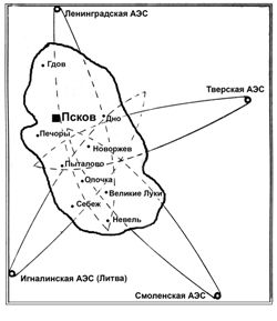 В соседних с Псковщиной Ленинградской, Тверской, Смоленской областях, а также в Литве, в Игналинке, находятся атомные АЭС. На этой оперативной карте показана возможная радиоактивная обстановка на территории Псковского региона при авариях и разрушениях реакторов на АЭС.
