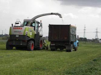 Новый комбайн используется на сеяных травах с высокой урожайностью. В «Победе» производится раздельная уборка зеленой массы. Сначала работают три самоходных косилки на скашивании озимой ржи, затем сгребаются валки, которые сдваиваются для того, чтобы обеспечить высокую производительность «Ягуара». К его первому выходу в поле приехало сразу несколько автомашин: в них загружают зеленую массу и отвозят в силосную траншею.