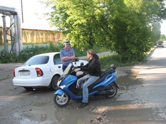 Наша машина была без опознавательных знаков ГИБДД. Водитель, лейтенант Максим Журбенко, сидит за рулем в штатском. Но его напарник, лейтенант Иван Казаченок, как и положено, одет по уставу. Такая маскировка позволяет незаметно приблизиться к нарушителю правил дорожного движения. Три недели инспектора ГИБДД Пскова наводили порядок среди водителей скутеров. Их владельцы ездят без шлемов, пренебрегают правилами дорожного движения, создают в городе аварийные ситуации. В ходе рейда было задержано около сотни нарушителей. Их основная вина – езда без шлемов. За это полагается штраф в размере двухсот рублей.