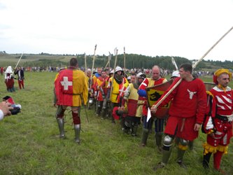 В полдень, когда солнце встало высоко, славяне, европейцы и представители других народностей, в которых были переодеты участники реконструкции, вышли на построение. Вслед за перекличкой началось постановочное сражение. Естественно, победили славяне. Зрители кричали, свистели, топали - всеми правдами и неправдами старались дезориентировать противников и помочь своим. После пережитого эмоционального накала аудитория разделилась: одни направились смотреть на турнир лучников, другие остались наблюдать за дефилированием участников в исторических костюмах. Как только показ мод был завершен, на площадку вышли воины, облаченные в боевые доспехи, в руках - оружие. Значит, близился пеший турнир, где реконструкторы выяснят, кто лучше других обращается с холодным оружием. В основном бои проходили с мечом и щитом. В финале азарт схватки был такой, что пришлось останавливать бой и поправлять ограждения. В итоге победителем из битвы «молодость против опыта» вышел бывалый реконструктор Евгений Биденко, представляющий калининградский клуб «Западная Башня». Стоит отметить, что на финал он шел с уже поломанным щитом. После окончания турнира особо любопытным зрителям рассказывали, о древних способах приготовления сыра. Почему именно его, а не какого-то другого продукта, осталось тайной...