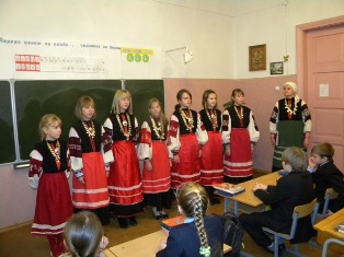 К одиннадцати часам участницы ансамбля собрались на первом этаже и со звонком к началу урока пошли по классам. Учителя прерывали занятия, чтобы дать возможность девочкам рассказать об обрядах и традициях сето: в одном классе - об обычаях, связанных с приемом гостей, в другом - о том, как пасли скот, в третьем - как славили Христа в Рождество. И все рассказы сопровождались сетоскими песнями. Были среди них и детская песенка юного пастушка, и традиционный плач. В результате к празднованию дня рождения оказались причастными большая часть учащихся гимназии. И все без исключения могли познакомиться с фотолетописью коллектива на специальном стенде. Рассказать о судьбе ансамбля мы попросили его руководителя Хелью Тсопатало: