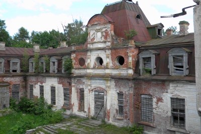 Мы идем по бывшему подъездному парадному кругу, подходящему к главному крыльцу дворца. Вдоль него полукругом усадебные здания: домик наездников, дом управляющего, построенный в стиле ложной готики, домовая церковь, кухонный домик, летний дом графини - старшей сестры графа Строганова, усадебная контора. Все это архитектурное богатство вокруг дворца теперь представляет печальное зрелище и окончательно рушится. За исключением - одного единственного здания - бывшей усадебной конторы. Оно сохраняется только благодаря тому, что в нем и сегодня располагается контора Псковского конезавода. Что и требовалось доказать: если есть жизнь в здании, не брошено на произвол стихии и вандалов - оно продолжает жить.