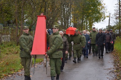 Как рассказал председатель Палкинского районного совета ветеранов войны и труда Борис Ильин, останки одного из бойцов были обнаружены текущим летом вблизи деревни Гороховище на высоте Гусакова Гора Жительница деревни Вера Иванова сообщила о находке в администрацию Палкинской волости. Члены районного поискового отряда «Эхо войны» извлекли останки воина. Других останков обнаружено не было. Второй боец был поднят районным поисковым отрядом вблизи деревни Козлы Качановской волости. Обнаружены и пробитая каска, остатки ремня и сапог, котелок, ложка, складной нож, карандаш в гильзе патрона. К сожалению, имен воинов установить не удалось. Борис Ильин отметил, что готовясь к 70-летию освобождения Палкинского района, необходимо исследовать места былых сражений, где проходила линия «Пантера», продолжить работу по поиску бойцов 164-го стрелкового полка, сражавшегося в июле 1944 года на границе Палкинского и Печорского районов. В церемонии перезахоронения принимали участие воины Островского гарнизона, ветераны ВОВ и военной службы, представители администрации района и городского поселения Палкино, жители районного центра.
