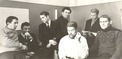 На публикуемом снимке новички вместе с уже маститыми «ленинцами» Владленом Смирновым, Витольдом Балагиным, Виктором Тимофеевым. Обращаю внимание на одну мелкую деталь, свидетельствующую о бедности редакции в те времена. У нас не было даже обыкновенных стаканов для того, чтобы выпить «по случаю» какого-нибудь разливного или алжирского с привкусом нефти вина. Бухгалтер купила для каждого сотрудника пластмассовые подставки для карандашей, вот их и использовали.