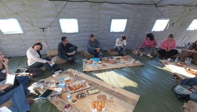 Дело даже не в том, что встреча на этот раз впервые стопроцентно отвечала формату «без галстуков», потому что проходила на съёмочной площадке полнометражного фильма «Батальон смерти», посвящённого событиям Первой мировой войны. Военная палатка, мешки с песком вместо стульев, алюминиевые кружки с обжигающим чаем - всё это сразу придало настроение. Но ещё до этого были: холм, с которого открывался вид на окопы, горящее поле со стелющемся дымом, кони, повозки, бритоголовые девушки в военной форме и требовательный голос Дмитрия Месхиева (кто не знает - режиссёра-постановщика): «Коля, что там с солнцем? Когда будет? Снимать пора…» Солнце - единственное, кто здесь не слушался Месхиева но в конце концов и оно осознало, и… : «Полная тишина на съёмочной площадке! Никто не ходит! Мотор…»