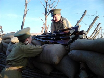 Я говорю «предсъёмочной», потому что привозят нас не совсем к объективам камеры А и камеры Б. Сначала нужно получить реквизит: подсумок на ремень, флягу, медсумку, вещмешок, наполненный сеном, свёрнутую шинель с привязанным к ней котелком и винтовку на хрупкие девичьи плечики. Навьюченные всем этим добром, с «левой-левой-раз-два-три» около полутора километров мы идём уже до съёмочной площадки. Радостным «Доброе утро, мои ангелы!» нас приветствует в громкоговоритель режиссёр фильма Дмитрий Месхиев, и лица «солдатов Джейн» образца 1917 года озаряют солнечные улыбки. Начинается самое интересное - съёмочный процесс.
