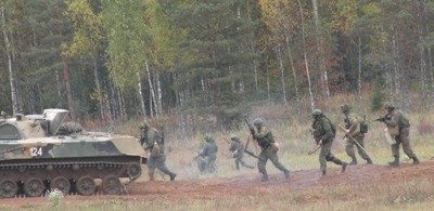 По плану мотострелки должны вступить в бой, а ВДВ находится в резерве. Но где находится враг, никто не знает и сценарий операции неожиданно меняется. Десанту приказано выйти в район, где предположительно находится противник, и вступить в бой. Итак, резерв становится авангардом: БМД выезжают на большое поле, боевые расчёты машин выстраиваются цепью за ними и начинается атака. Сначала над полем пролетают штурмовики: по противнику наносится удар, который заставляет нас пригнуть головы. Десантники метают гранаты и, при поддержке вертолётов, устремляются вперёд. «Наших» на поле мало: их цель - разведка боем. Выяснив, сколько огневых точек у противника и его примерную численность парни отступают. Враг преследует псковичей – кажется, что бой проигран. Здесь в дело вступают мотострелки. Они прикрывают огнём ВДВ, и заставляют бандформирование остановиться.