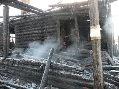 Над одноэтажным обгорелым зданием поднимается небольшой дымок. Рядом с крыльцом (вернее тем, что от него осталось, как и со всем зданием) местные ребятишки. Правда, в дом не суются - ума хватает. Делать им в обугленном помещении, естественно, нечего. А вот мы пробираемся через брёвна в дом. Слева от входа было жилое помещение. Теперь здесь царит хаос: обгоревшее кресло, валяющиеся на полу чайник и кастрюля, перевёрнутая тумбочка… Жители этой комнаты спаслись из огня чудом. Как нам рассказала жительница соседнего дома, к которой и прибежали ночью погорельцы, их разбудила собака. Трёхмесячный щенок начал скулить, хозяева проснулись и увидели, что прихожая уже вся в огне. Они успели выскочить из помещения, а вот их спаситель - нет. Щенок ценой собственной жизни спас хозяев от мучительной смерти в огне. Вот уж действительно, друг человека!