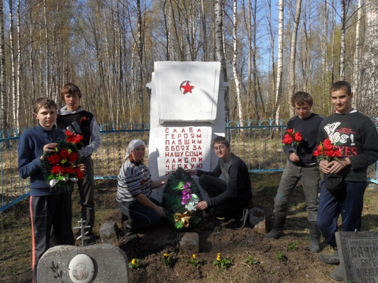 К захоронению в Хайлово вышли волонтеры из Верхолинской основной школы. Вместе с преподавателями они прошли четыре километра пешком. Территорию очистили от мусора, сухой травы и опавших листьев, заштукатурили трещины на памятнике, очистили его от старой краски, а также ограду вокруг - и покрасили её вновь. И, конечно, посадили цветы и возложили венок в память о захороненных здесь воинах.