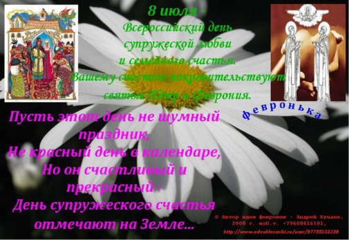 В поисках альтернативы Андрей стал изучать жития русских святых, покровительствующих браку. История Петра и Февронии, описанная еще в 17 веке монахом Ермалаем-Еразмом, его поразила: сказка, основанная на реальных событиях. Крестьянка вышла замуж за князя и хранила ему верность до конца дней своих. Изучив эти материалы, Андрей убедил работников местного Дома культуры возродить праздник на астраханской земле. И придумал специальные открытки с признаниями в любви наподобие европейских «валентинок». Журналист почти сразу отказался от идеи рисовать ангелочков. Слишком банально и узнаваемо. Вместо этого он предложил ромашку, как символ душевной чистоты и название «февронька». Первые открытки появились в храме Александра Невского в городе Знаменске. Прихожане отправляли их своим друзьям и родным. Идея пришлась астраханцам по душе. Но Андрей решил на этом не останавливаться. Он написал письмо Патриарху всея Руси Алексию, отправив свой вариант февроньки и предложение придать празднику статус государственного. Ответа журналист не получил, однако слова его дошли до адресата. Через несколько лет один из священников, ссылаясь на слова Патриарха, говорил о необходимости возрождения забытого праздника и о куцаевских февроньках. Материалы об этом появились в ряде модных европейских журналов. Дальше случилось еще нечто более невероятное. По инициативе Светланы Медведевой, жены тогда ещё действующего президента - праздник любви, семьи и верности стал государственным. И его символом стала ромашка, впервые появившаяся на астраханских открытках. Может быть, это простое совпадение, а, может, Светлане Медведевой каким-то образом попались на глаза февроньки Андрея Куцаева. Конечно, второй вариант нашему коллеге нравится больше.