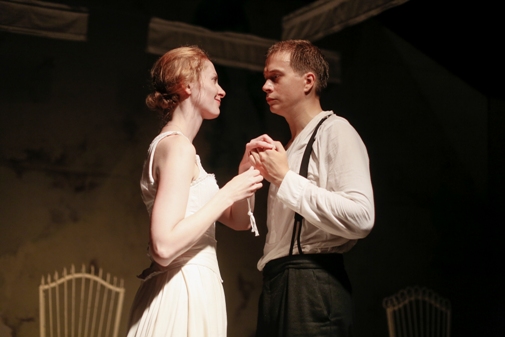 - Пётр Наумович считал, что этот материал ставить невозможно. А мне стало интересно. Зачем брать простых авторов? Этот рассказ о космосе, любовь там огненная, высокая, - улыбается Ирина «Космонавтами» стали молодые актёры Юлия Марченко и Степан Балакшин. Двадцатиминутный рассказ они превращают в полуторачасовое действо. Впрочем, самого действа как раз не так много, значительная часть сценического времени отводится «проигрыванию» внутренних переживаний. Бунин не раз называл свою героиню «маленькой женщиной», но Юлия примерно одного роста со Степаном. Вместо смуглого загара, которым автор словно любовался, описывая Прекрасную Незнакомку, очаровательный румянец, начинающий пылать на лице актрисы, едва её героиня чуть смущалась. Тем не менее, она была той самой Прекрасной Незнакомкой, женственной, свежей, тонкой, игривой, прелестно смеющейся, в которую так легко влюбиться и полюбить на всю жизнь. Степан Балакшин удивительно хорошо сумел передать ту разницу между Поручиком в начале рассказа, опьянённым внезапно нахлынувшим чувством, порывистым, беззаботным, и в конце – рефлексирующим, словно постаревшим на десять лет. Ему, наверное, особенно тяжело было понять язык женщины-режиссёра, которая сама признаётся, что говорила с актёрами ассоциациями, просила не выполнить какую-то задачу, а почувствовать.