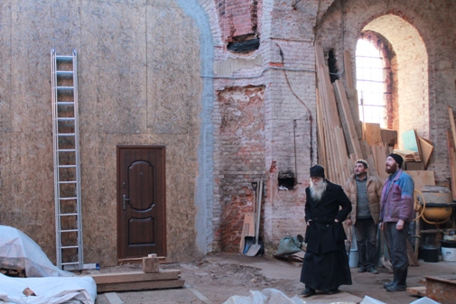 Доброго всем дня! На сегодня в церкви Архангела Михаила отец Георгий служит в правом пределе, где более-менее созданы условия для службы, установлена печка, но все равно требуется внутренняя отделка и очень нужен иконостас. Основное помещение нуждается в полной реконструкции: надо делать крышу (она сгорела), полы (тоже сгорели), вставлять окна, и т.п.