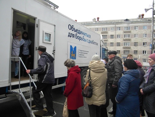 Мобильный диабет-центр работал на Октябрьской площади два дня. Чтобы бесплатно проверить уровень сахара крови многие приезжали из соседних районов и занимали очередь с самого утра. Впрочем, ажиотаж оказался излишним. Лаборанты работали так быстро, что уже к обеду у ступенек мобильного комплекса не было ни одного человека Распределять поток пациентов помогали псковские волонтеры.