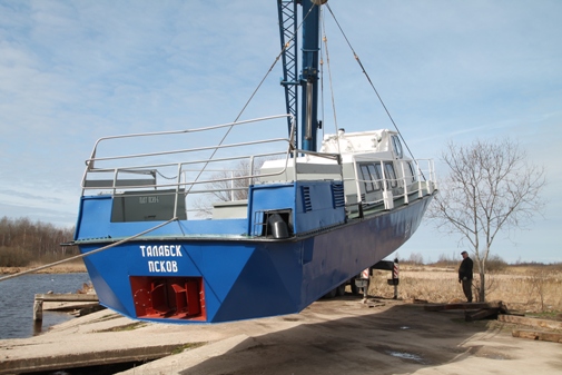 22 апреля катер на большегрузном автомобиле уже привезли из Пскова, где он хранился и ремонтировался в зимние месяцы, и при помощи автокрана спустили на воду у причала в деревне Толба. Это гораздо быстрее, чем добираться своим ходом по воде. Мероприятие прошло без эксцессов, опытный крановщик настолько «нежно» опустил свежеокрашенный корабль на воду, что даже волна не поднялась. В Толбу привезли и кассу для продажи билетов, и стандартную щитовую бытовку. В ближайшее время на ней появится стенд с расписанием рейсов и стоимостью билетов. Первый, пробный выход в озеро должен состояться в последних числах апреля. Напомним, что катер КС-110 «Талабск», выпущенный в ноябре 2006-го, спустили на воду в июне 2007 года. На момент выхода катера на маршрут на островах им. Залита и Белова проживали 240 человек. График движения судна «привязан» к расписанию автобуса до Толбы.