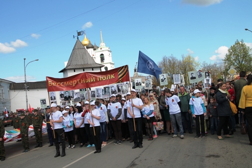 По словам координатора акции «Бессмертный полк» в Пскове Татьяны Артюниной, собрались более тысячи жителей Пскова. Они прошли торжественной колонной от площади Ленина до Зелёного театра. Кроме того, псковичи присоединились и к всероссийской акции «Солдатский платок». Учащиеся школ города, воспитанники Центра «Патриот» пронесли как символ памяти полотнище длиной 80 метров. «Солдатский платок» сшит из маленьких лоскутов, которые со всех районов области прислали учащиеся школ - на маленьких платочках вышиты имена солдат Великой Отечественной.
