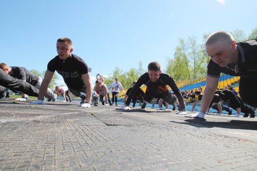 Инициаторы международного «Рекорда Победы» проводят параллели между спортивными подвигами и подвигами на войне. Смысл акции – пробудить в молодёжи желание быть такими же сильными, как поколение героев, и популяризировать здоровый образ жизни. Участники акции с обелёнными сединой висками наглядно подтвердили положительное влияние спорта на организм человека, отжимаясь наравне с молодыми людьми. Некоторые усложняли себе задачу и делали отжимания с хлопками. Ну а спустя полтора часа после старта мероприятия бурные овации сотрясли весь «Машиностроитель» - псковский «Рекорд» состоялся!