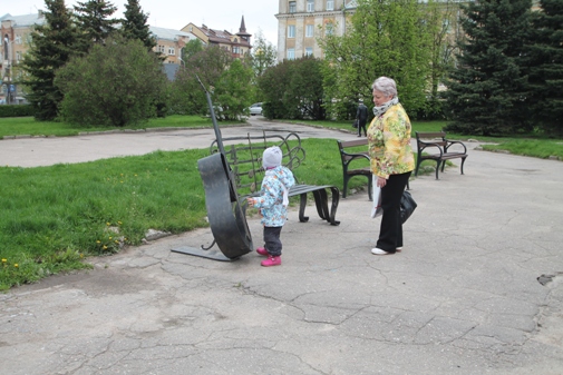 Сквер с трёх сторон окружён жилыми домами, да и расположен на многолюдном Рижском проспекте, поэтому люди проходят сквозь него постоянно И, конечно, видят кованые инсталляции псковских кузнецов под руководством Евгения Вагина: «Полку букиниста», «Скамейку музыканта» и «Мольберт художника». Псковичка Елена Евчук служит в органах внутренних дел, но сегодня отдыхает и гуляет с внучкой. Та сначала увлекается книгами, но затем убегает к музыкальной скамейке.