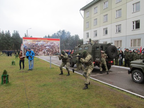 В заключение торжественного открытия прошли показательные выступления Псковской бригады специального назначения. Воины продемонстрировали, как спецназовцы будут освобождать заложников в одной из южных стран. На поляне перед казармой будто бы расположился лагерь террористов. Бородатые мужчины приехали туда на дорогом внедорожнике под зелёным флагом с арабской вязью. Из автомобиля вывели человека с натянутым ему на голову чёрным мешком. По легенде, это был пленный российский летчик, сбитый во время боевого задания. Его намеревались казнить перед камерой и выложить видео в Интернет. Боевики поставили пленного на колени и начали устанавливать видеооборудование.