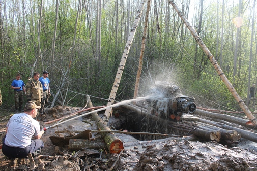 «Движок» с трудом вытаскивают, закрывают яму брёвнами, и опускают уже на них. Моют под напором болотной воды, поисковики с нетерпением ждут. Наконец, собираются кучей-малой вокруг: трогают металл, фотографируют.