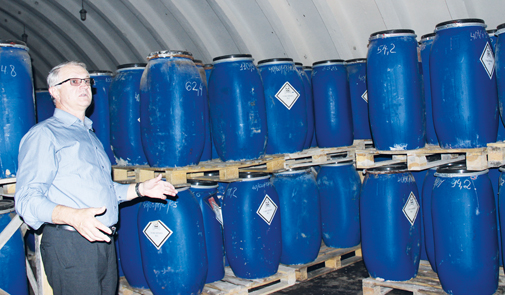 В таких ангарах, строившихся по нормативам помещений высшего класса опасности и подремонтированных для работ с ядерным топливом и снаряжения боевых зарядов, в специальной пластиковой таре хранятся пестициды. Специфический запах, конечно, присутствует, но не напрягает даже без средств защиты. Регулярно производящиеся замеры температуры контейнеров свидетельствуют о стабильности внутренней среды, об отсутствии в ядах каких-либо химических реакций. Здесь же производятся замеры для химического анализа воздуха, грунта, вод. По словам специалистов - все в норме. Страшное слово «яды» на желтой табличке у ангара - дань нормативам и, конечно же, повод для того, чтобы время от времени будоражить общественное мнение самим фактом наличия и консервации этих самых ядов.