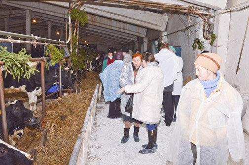 Интересный момент: на ферме уже ощущается новогоднее настроение - стойла коров украшены еловыми веточками. Которые, между прочим, некоторые из «постояльцев» не только нюхали, но и с удовольствием пробовали. Впрочем, делали они это только из любопытства, на меню коровам жаловаться не приходится, кормят их от души. Животные получают всё, что необходимо для хороших надоев: комбикорм, силос, пивную дробину, минеральные добавки. Кроме того, в меню входят сенаж, свекловичный жом, соль. Ухаживает за животными слаженный коллектив из четырёх доярок, работающих здесь уже много лет.