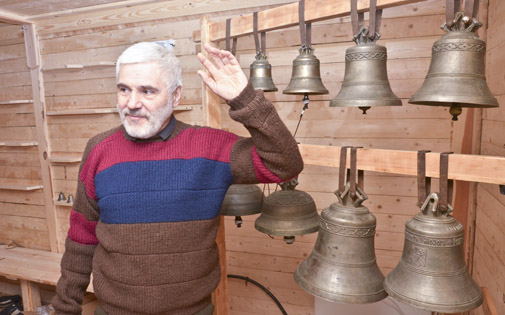 Александр берет отвертку и пластиковым наконечником касается каждого колокола. Чистота звука и абсолютно равное расстояние между тонами звучания - малая септа - радуют слух. А мастер за время выездов на ярмарки в Ярославль и Вологду, оказывается, и звонарскому делу подучился: берет в руки канаты и. мир вокруг оживает. Насыщенный малиновый звон заполняет комнату. В их доме это упражнение - ежедневный ритуал, который здоровья хозяевам придает (пока звонили - не болели, а во время переезда - почувствовали). А еще эта удивительная домашняя звонница, закрывающая септаккордами три октавы, изводит из дома мышей.