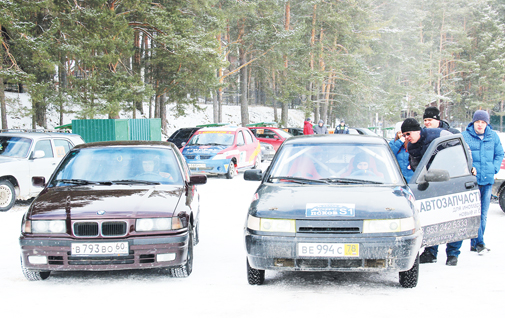 Быстрой сменой резины на «боевую», с шипами по 1,5 см, автомобили из обычных - для взрослого чемпионата или первенства «-18» -превращались в спортивные, и руль попадал в руки другого мастера. Большинство автомобилей - самые обычные «Жигули», «Рено», «Фольксвагены». Обязательная псковская «фишка» - «Волги», выделены в одном только нашем регионе в отдельную состязательную категорию. Реже (кажется, тяжеловато для виражей) - БМВ. Из автоэкзотики, которую не увидишь на улицах города и на которую нереально получить номера - облегченные и переоборудованные спортивные машины, в том числе - багги с задним приводом, собранный руками Геннадия Попова из груды « родного», похожего на багги металлолома. Вот уж не ожидала встретить участника хореографического ансамбля «Завалинка» в шлеме гонщика с автомобильным ключом в руках! Говорит, что настоящим спортсменом себя не считает, но жить без гонок не может. Таких вот широких интересов у нас люди!