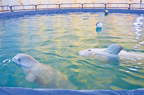 Для визита журналисты «Псковской провинции» специально выбрали свободный от представлений, «технический день», когда в бассейне наводят порядок, осматривают животных и готовятся к следующим представлениям.