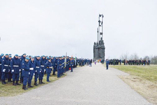 Затем состоялась торжественная церемония возложения гирлянды Славы и цветов к подножию монумента, прозвучали Государственный гимн Российской Федерации и троекратный оружейный салют. Завершился митинг торжественным маршем воинов Псковского гарнизона и патриотических клубов города и области. Вместе со всеми в парадном строю печатали шаг и новобранцы-юнармейцы. Особенно символично, что именно в это время над горой Соколихой легли на боевой курс военно-транспортные гиганты Ил-76, взлетевшие с Псковского аэродрома. Казалось, что они тоже участвуют в параде, на это обратили особое внимание пришедшие на митинг офицеры ВДВ и военно-воздушных сил.