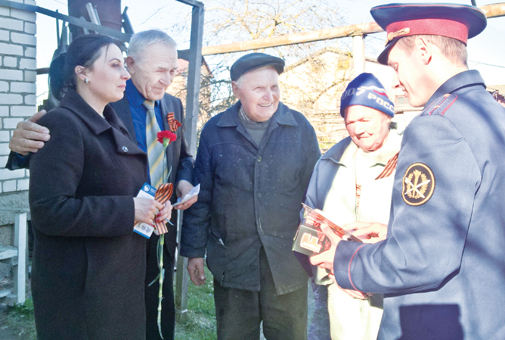 В Псковском районе осталось очень мало участников войны. Один из них - Иван Дмитриевич Хвостов - живет в деревне Родина. К нему мы и направляемся. Ветеран радуется нашему приходу - шутит, поет песни, не устает нахваливать молодежь и с удовольствием фотографируется. Он бодр и приветлив. Правда, слышит плоховато, что, впрочем, неудивительно. Майор Хвостов на фронте был артиллеристом, воевал на 1-м и 2-м Белорусских фронтах, освобождал Бобруйск, Минск, Варшаву, Прагу. Юлия Зернова и Виталий Дидыч благодарят Ивана Дмитриевича за Победу, а Николай Александров - за активную общественную работу. Долгое время Иван Хвостов возглавлял первичную ветеранскую организацию Завеличенской волости и всегда был принципиальным в отстаивании интересов людей старшего поколения.