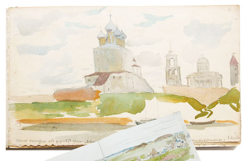 Стараниями сотрудников «Михайловского» в фондах музея сейчас хранятся и эти, 1903 года, письма и небольшой - девять с небольшим в ширину и шестнадцать с половиной сантиметров в высоту - альбомчик, который художник использовал как своего рода художественную записную книжку, для акварельных и карандашных набросков в путешествии.