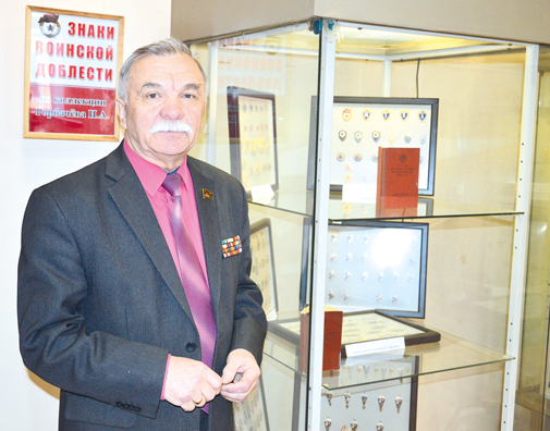 В стеклянных витринах представлены тематические планшеты со знаками воинских частей и подразделений, выпускников суворовских училищ, высших образовательных учреждений, книжки красноармейцев и уставы разных лет, кокарды и погоны. Словом, даже человеку, далекому от воинской службы, есть чем заинтересоваться и увлечься. Коллекция систематизирована и подобрана так, что позволяет проследить изменения, происходившие в наших Вооруженных Силах, практически всю их историю по внешней атрибутике.
