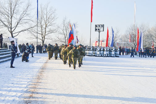 У монумента в парадном строю застыли моряки и лётчики, десантники, спецназовцы, пограничники - одним словом, все, кто выбрал своей профессией защиту Родины. Парад принимал командир 76-й гвардейской десантно-штурмовой Черниговской Краснознаменной, ордена Суворова дивизии Игорь Каплий. Затем память воинов Красной Армии почтили минутой молчания и трехкратным салютом.