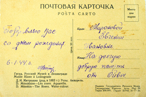 Открытка, отправленная в 1943 году, отпечатана за девять лет до того. Представьте сами, какими надо обладать чувствами, чтобы при тяжёлой работе на далёких лесозаготовках найти открытку