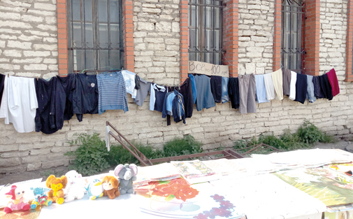 Например, улица Пушкина, участок от перекрёстка у театра до входа на центральный рынок. Здесь, на кирпичной стене, где в далёкие советские времена за стеклянными витринами размещались афиши и плакаты, теперь разложены товары, что, кажется, пришли из тех же советских времён: постельное бельё из грубой ткани, спортивные штаны с растянутыми коленками, нижнее бельё, больше похожее на куски брезента. Кроме того, стена покрыта какими-то надписями вроде «Распродажа» или «Скидки», нанесёнными прямо на кирпичи. Впрочем, под слоями навешанной на стены одежды точно прочитать надписи не удаётся.