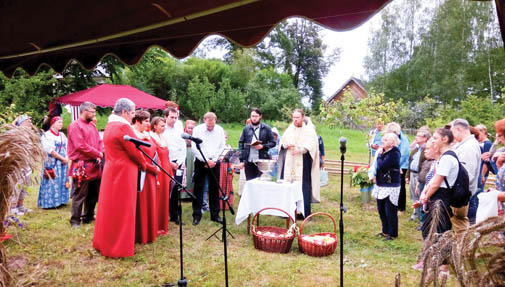 По традиции праздник и в этот раз начали с молитвы - с водосвятного молебна и с чина освящения плодов, который провёл настоятель храма Казанской Божией Матери в Пушкинских Горах отец Михаил. В сослужении у него были певчие из Псково-Печерского монастыря, точнее, новый, менее месяца назад созданный концертный ансамбль из числа участников монастырского хора.