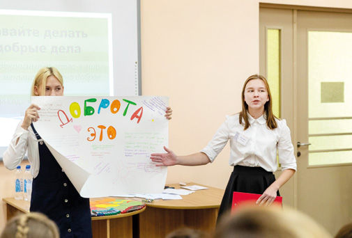 Московским гостям было интересно узнать, почему на форумах в Интернете многие горожане называют инженерно-лингвистическую гимназию «доброй». После короткой экскурсии Анна Кузнецова и Сергей Кравцов убедились в абсолютной справедливости этого определения. А доброй эта школа является вовсе не потому, что там сделан евроремонт, а в классах установлено современное оборудование. Такими «фишками» сейчас мало кого удивишь. По-настоящему славится гимназия не «углами», а добрыми делами. Все школьники, начиная от малышей и заканчивая выпускниками, стараются бескорыстно помогать тем, кто рядом. Неудивительно, что на призыв Анны Кузнецовой открыть в каждой школе «Класс доброты», который прозвучал на молодежном форуме «Рубеж» в Калужской области, одними из первых в России откликнулись именно псковские школьники. А учителя их поддержали. Пробный урок в этом необычном классе провели старшеклассники, а среди первых слушателей были и московские гости.