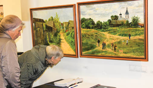 Экспозицию посетили, наверное, все псковские мастера и неравнодушные к искусству люди: отойти, чтобы рассмотреть с расстояния требующие того полотна, было невозможно. А смотреть хотелось еще и еще. На буйство летних трав, бесконечное и затейливое небо, на капризную по погоде гладь озера, на самобытные дома и белоснежные храмы, узнавать каждую дорогу и тропинку, подземный предел с присутствием преподобного Досифея и - самих художников в сопровождении веселого хозяйского пса, размещающихся на пленэре.