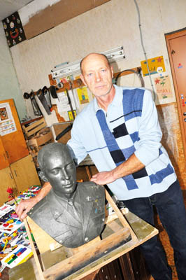 Размером и проработанностью, тонким психологизмом выделяется бюст Героя России старшего лейтенанта Сергея Шевелева. Сын мастера погиб в Цхинвале (Южная Осетия) десять лет назад, ему было всего 27 лет. В честь героя установлена мемориальная доска на Псковской школе №16 и бюст на плацу Михайловского артиллерийского училища в Санкт-Петербурге. Недавно отца попросили отреставрировать бюст, но затем обошлись своими силами, и он остался в мастерской - неслучайный, до боли похожий и живой. И жаль, что до отливки дело не дошло: работа тонкая и очень родная, а пластилин недолговечен.