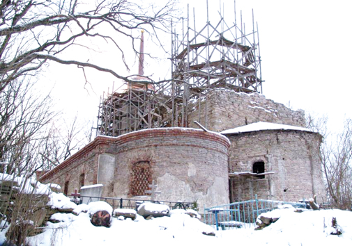 Один из активистов - Андрей Матченя рассказал, что площадь кровли только над основным, сохранившим уникальные своды пределом, 200 кв.м, из-за большого объема решили укрыть толем. Окна прикрыли. Но ветер гуляет: двери худые, в них и над ними щели, что бойницы. И выход в обширный, вдоль всего храма боковой предел просто прикрыт плотной пленкой. Предел Тихвинской иконы Богоматери был пристроен к храму в конце XIX века. Сегодня он открыт небу и земле, с разрушающимися стенами и замшелыми зелеными останками реставраторских лесов: здесь без хозяйствующего субъекта ничего не сделать. А вот на двери надо уже собирать деньги, да подумать, как исполнить получше. Помещение нужно закрыть от непогоды.