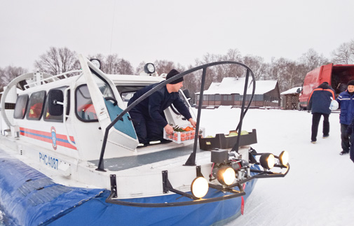 Подобные поездки уже стали привычными для спасателей, а именно борт МЧС не первый год привозит островитянам еду, посылки и другие товары в периоды сложной ледовой обстановки. В настоящее время она как раз сложная - холодно, ветрено, и при этом лёд ещё тонкий. Ходить по нему опасно, не говоря уже о том, чтобы проехать на машине. Единственный выход - «Хивус-10», так называется катер на воздушной подушке, амфибия, предназначенная для круглогодичной эксплуатации. Строят такие катера в Нижнем Новгороде. Первые рейсы на Талабы «Хивус-10» совершил ещё в начале декабря. Периодичность - примерено раз в две недели.