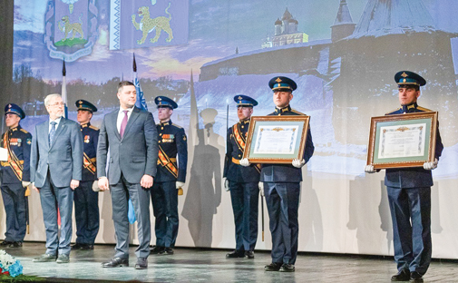Церемония началась под звуки Преображенского марша. Знамённая группа - молоденькие лейтенанты 76-й дивизии - внесла в зал Государственный флаг РФ, флаг Псковской области и свидетельства о госрегистрации символов региона. Зал, в котором не было свободных мест, встретил их стоя.