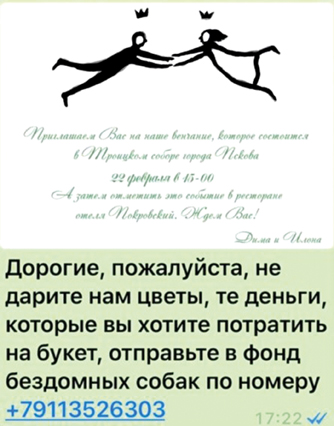 Сначала подумали - кто-то ошибся с переводом, но ситуация повторялась. Оказалось, что венчающиеся молодожены, красивая и знаменитая в городе пара, в своем приглашении на венчание просили гостей не тратить деньги на букеты, а перевести их в «Шанс», где монетизированным «цветам» найдут полезное применение.