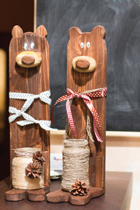 В качестве мастерской у Ирины небольшое подсобное помещение, где едва помещается ленточная пила, торцовка, фрезер, небольшие сверлильный и токарный станки. На стеллажах - заготовки для работы и пилотные модели для поделок с ребятами, кормушки, ящички для инструментов и цветов, вечный календарь, самолет, машинка и танк, светильник-жираф, фигурки медведей для украшения интерьера.