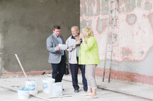 Прораб стройки Владимир Ивачев рассказывает, что сейчас на объекте работают семь человек, если надо будет ускориться, можно будет усилить бригаду, но пока каждый справляется на своем месте. В помещении спортзала уже заменены вентиляционные установки, скрыта под штукатурку новая проводка. Отштукатурить низ, побелить, покрасить - и можно будет приступать к устройству пола. По проекту пол деревянный крашеный, с волейбольной разметкой. Неожиданностей быть не должно.