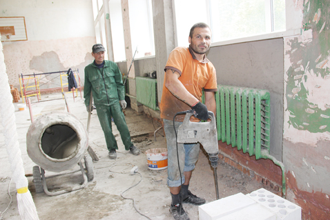 Со снятым полом и белым ребристым потолком, новыми, в два яруса, окнами спортзал кажется огромным. И фронт работ в нём не меньше. На лесах в самом верху рабочий наносит на потолок шпаклевку. Внизу работают штукатуры, а зудящий отбойник задействован в выравнивании основания пола.