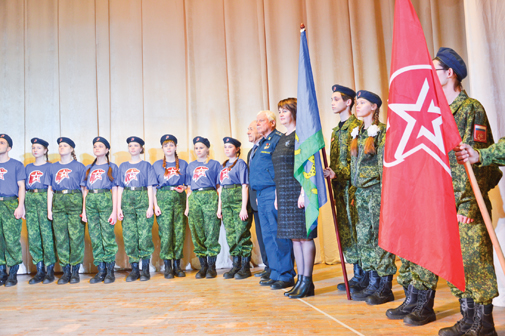 Звучит команда: «Равняйсь, смирно». Вносятся флаги России, Псковского района, знамя Юнармии. В тишине зала начальник штаба Юнармии Псковского района Алексей Николаев докладывает главе района: «Учащиеся Москвин-ской школы для вступления в ряды Юнармии построены».