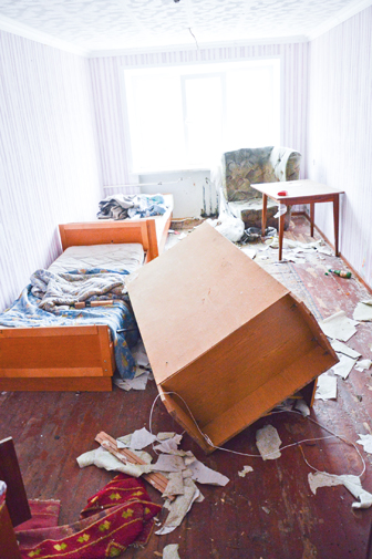 Следующий пункт - заброшенное общежитие. На первом этаже окна забиты фанерой, в коридорах темно, как в голливудских фильмах про зомби-апокалипсис. В некоторых комнатах пол засыпан крысиным ядом. Кругом валяются брошенные вещи, книги, мебель, матрасы, посуда. Вот лежит плюшевый мишка, через несколько шагов шланг от противогаза и детская коляска, будто люди не уходили, а убегали.