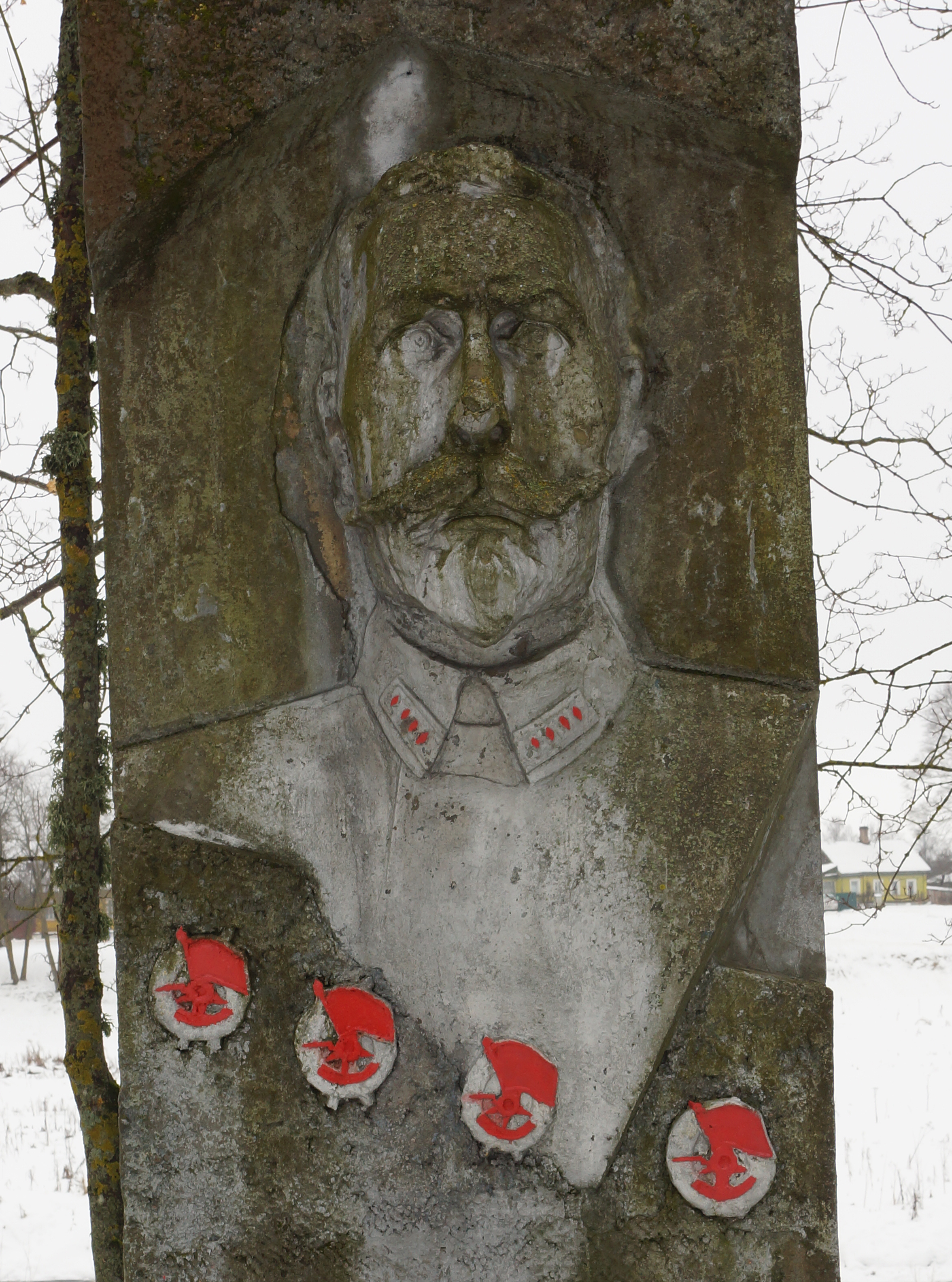 В 8о-е годы прошлого века рядом с братскими захоронениями установили памятник красному командиру и герою Гражданской войны, воевавшему в районе Гдова, Яну Фабрициусу. Он представляет собой стелу с барельефом. Все бы ничего, если бы не лицо героя. Оно какое-то испуганное. Чего стоит одно выражение глаз! Как такое пропустили советские партийные чиновники?